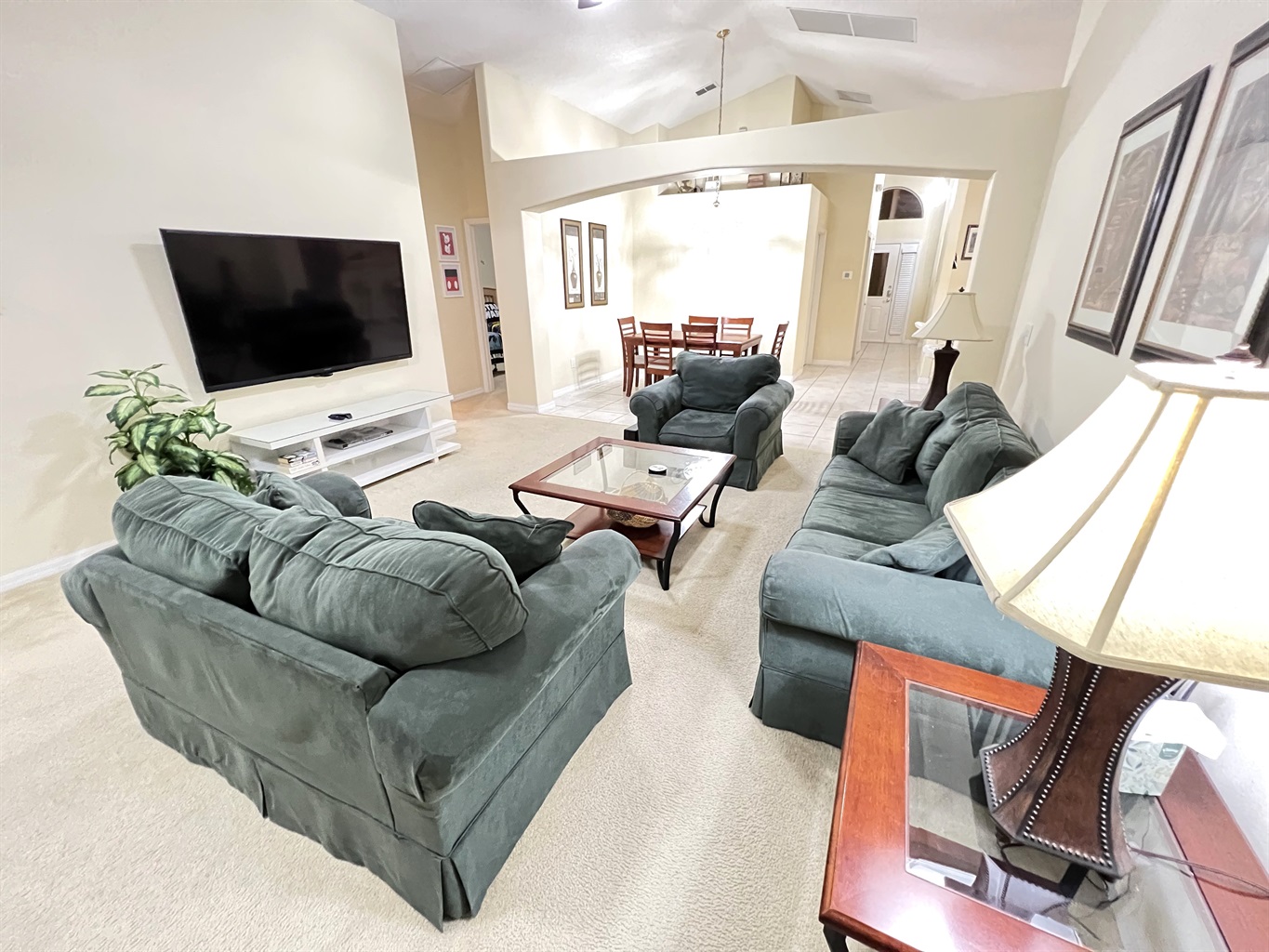 The house's layout includes a spacious single-story living space with an open-plan design that encompasses the family/living room, kitchen, breakfast room, and formal dining area. The well-equipped kitchen provides all the necessary appliances and gadgets you might need, while the nearby dining table comfortably seats six guests. A convenient breakfast bar adds extra seating options. At the rear of the villa, you'll find the family lounge, furnished with comfortable seating and a large 75-inch HD Smart LED flatscreen TV. The lounge also provides access to the sunny southwest-facing pool deck.