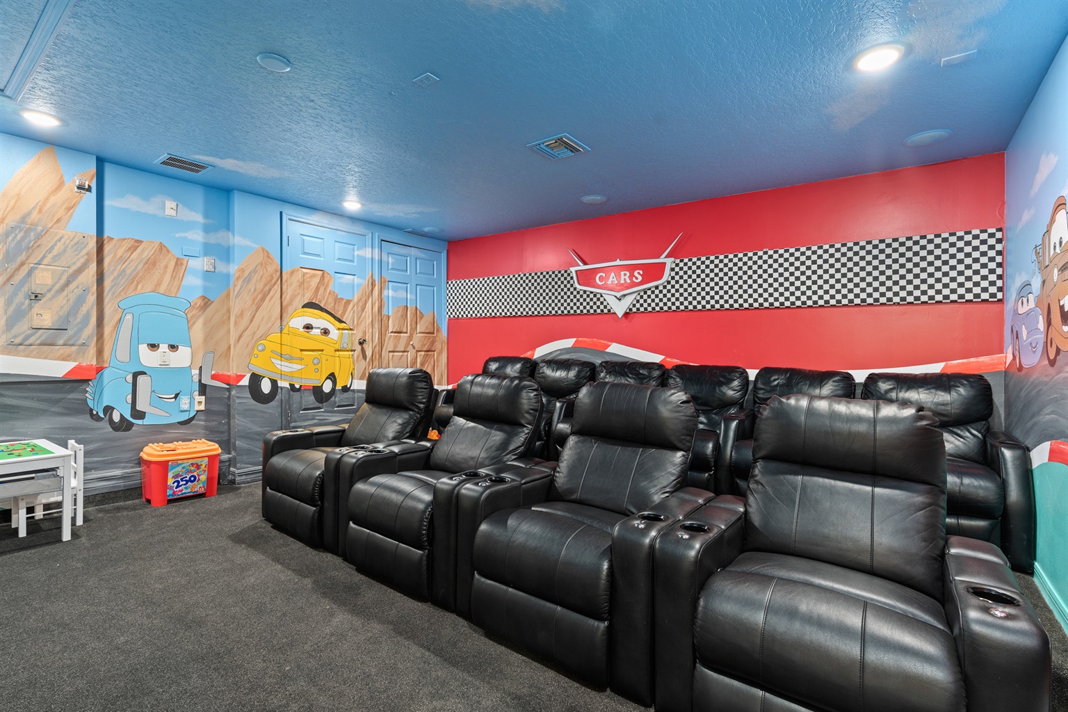 The kids and big kids in your group will love what we have done with the garage — turned it into a large movie theater / Cinema with reclining chairs, Dolby surround sound, and a large screen TV with DVD, Roku, and Streaming!